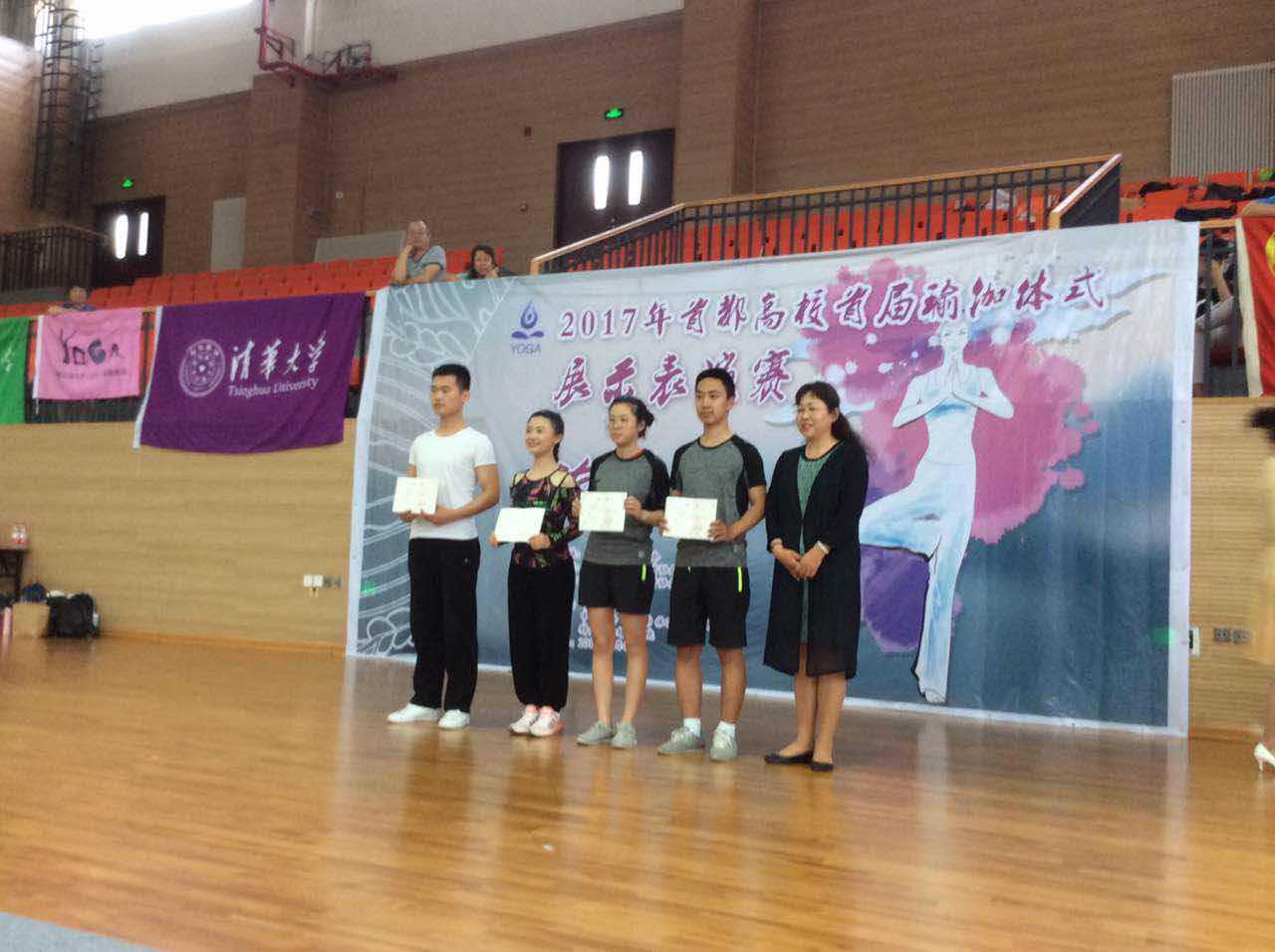 各校運(yùn)動(dòng)員身著瑜伽表演服,或是裙裾飄飄,或是青春健美,伴隨著寧靜優(yōu)雅的瑜伽背景樂,組合變換著一個(gè)又一個(gè)賞心悅目的瑜伽體式: 伸展、擰 轉(zhuǎn)、力量、平衡。整個(gè)賽場洋溢著輕松愉悅的氣息。 我校由體育部的王娟老師和蔡曉竹老師帶隊(duì)參加了本次比賽的四個(gè)項(xiàng)目