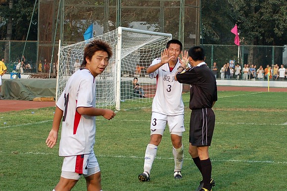 面對(duì)如此的偏袒行為,我校足球隊(duì)總教練金志揚(yáng)也忍耐不住,向第四裁判提出交涉。