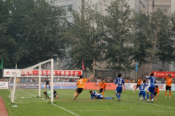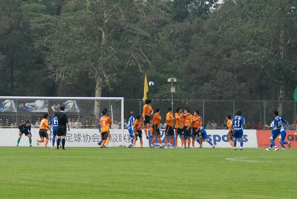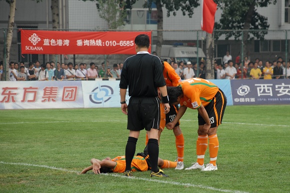 也許是輕敵的緣故,廣州醫藥隊一上來踢得有些漫不經心。而學生軍面對勁敵絲毫沒有放棄,大家都鼓足了勁奮力一搏。比賽前20分鐘雙方各有破門機會,廣藥并沒能在學生軍身上占到便宜。相反,愛國者大學生隊頻頻通過反擊威脅廣藥的防線,第26分鐘,韓國留學生金俊植左路帶球狂奔10余米后大力抽射,球稍微高出廣藥大門。第29分鐘,愛國者大學生隊隊長袁微被廣州醫藥外援撞傷,一分鐘后他再次被踢中,受傷不輕,被擔架抬出場外后才再次回到場上。