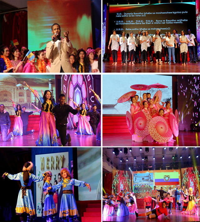 頒獎(jiǎng)典禮結(jié)束后,北京理工大學(xué)2017“一帶一路”留學(xué)北理聯(lián)歡會(huì)正式開始,從中國出發(fā),沿絲綢之路,再回到中國,展現(xiàn)了我校留學(xué)生的才藝特長和豐富多彩的精神生活。我校每學(xué)期為留學(xué)生開設(shè)功夫選修課,留學(xué)生武術(shù)隊(duì)的功夫表演震撼全場(chǎng),弘揚(yáng)了中華文化;來自中亞、西亞、歐洲的舞蹈向我們展現(xiàn)了曼妙多姿的異域風(fēng)情;南非學(xué)生的大合唱和膠靴舞則向我們展現(xiàn)了狂野的非洲文化,他們是我校第一批由南非自由州政府選拔的優(yōu)秀獎(jiǎng)學(xué)金生,表現(xiàn)優(yōu)異;南亞印度舞奔放熱情,老撾舞蹈優(yōu)雅婉約,傳統(tǒng)的鼓聲仿佛把我們帶到了美麗的東南亞;當(dāng)我們跟著絲綢之路的腳步再次回到中國,則是留學(xué)生中心老師們的江南舞,她們優(yōu)美的舞姿贏得了學(xué)生的陣陣喝彩;來自德國、波蘭、尼日利亞等18個(gè)國家學(xué)生表演的歌舞《闔家歡》將晚會(huì)推向高潮,同學(xué)們更是在舞臺(tái)上擺出了BIT的隊(duì)形,以表達(dá)他們對(duì)北理工的熱愛。
