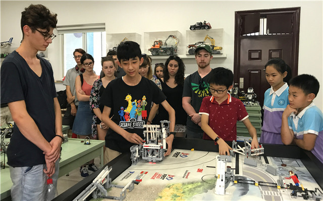 在附小同學們參觀了棒球隊、機器人教室等,在機器人教室里小學生代表給留學生朋友們展示了如何指揮機器人一步步成功地完成指令,機器人精彩的表現令留學生大開眼界,驚呼“中國的小學生太聰明,太厲害了!”。