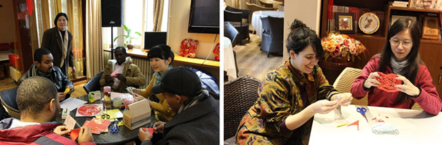 On that day, many students came to the lounge very early to help the teachers hang lanterns, paste Chinese paper-cutting and couplets, and decorate the lounge according to the Chinese Spring Festival customs. This event was divided into four parts including paper cutting, lantern riddles guessing, Chinese calligraphy writing, and dumplings making. Students from Pakistan, Rwanda, Germany, America and many other countries all participated in these activities.