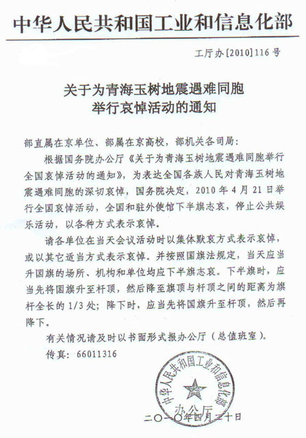 關于為青海玉樹地震遇難同胞舉行哀悼活動的通知