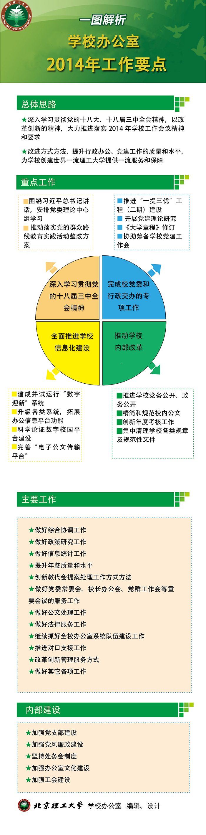 2013年,學校辦公室在學校黨委、行政的領導下,秉承著“服務·參謀·創新·提高”的理念,著力在提升喜哦能、改進作風、超前謀劃、精細服務上下功夫,取得了良好效果,全部完成了年初制定的工作任務。2014年,學校辦公室將繼續深入學習貫徹黨的十八大、十八屆三中全會精神,以改革創新的精神,大力推進落實2014年學校工作會議精神和要求,改進方式方法,提升行政辦公、黨建工作的質量和水平,為學校創建世界一流理工大學提供一流服務和保障。