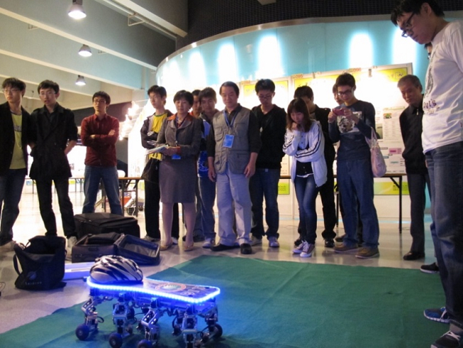 2011年10月22日上午十時,本次全國大學(xué)生創(chuàng)新年會參賽作品競賽正式開始,賽場氣氛即緊張又熱烈,各校選送的參賽作品科技含量高、專業(yè)覆蓋廣,充分反映了各參賽高校大學(xué)生課外創(chuàng)新活動的最高水平和最強(qiáng)實(shí)力。我校兩項(xiàng)參展作品憑借先進(jìn)的理念、創(chuàng)新的構(gòu)思、優(yōu)異的表現(xiàn),在眾多參展作品中脫穎而出,成為閃爍的明星。尤其是“新型節(jié)肢機(jī)器人”,其豐富的行進(jìn)步態(tài)、精彩的運(yùn)動效果、可靠的控制性能、超群的演示功能,使之成為競賽現(xiàn)場的“強(qiáng)中強(qiáng)”和“王中王”。教育部部長助理林蕙青、科技部政策法規(guī)司副司長王宇等領(lǐng)導(dǎo)一到比賽現(xiàn)場,首先就來到我校展位觀看新型節(jié)肢機(jī)器人的運(yùn)動展示。在饒有興致地聽取了項(xiàng)目組組長吳帆同學(xué)的細(xì)致講解并仔細(xì)觀看了機(jī)器人的全套表演后,林蕙青部長助理緊握帶隊(duì)老師兼指導(dǎo)教師羅慶生教授的手,高度評價說:“節(jié)肢機(jī)器人的表演實(shí)在太精彩了!老師辛苦了!同學(xué)們辛苦了!”