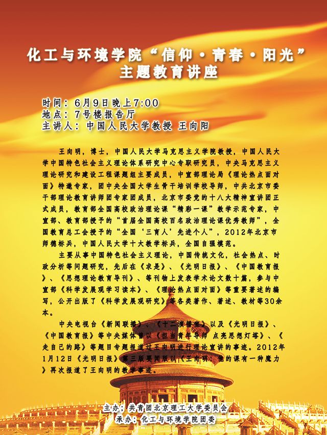 王向明,博士,中國人民大學馬克思主義學院教授,中國人民大學中國特色社會主義理論體系研究中心專職研究員,中央馬克思主義理論研究和建設工程課題組主要成員,中宣部理論局《理論熱點面對面》特邀專家,團中央全國大學生骨干培訓學校導師,中共北京市委干部理論教育講師團專家團成員,北京市委黨的十八大精神宣講團正式成員,教育部全國高校政治理論課“精彩一課”教學示范專家,中宣部、教育部授予的“首屆全國高校百名政治理論課優秀教師”,全國教育總工會授予的“全國‘三育人’先進個人”,2012年北京市師德標兵,中國人民大學十大教學標兵,全國自強模范。