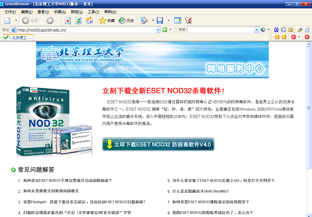 在校內(nèi)任何一臺可以訪問校園網(wǎng)的機(jī)器上,打開機(jī)器的IE瀏覽器,輸入網(wǎng)址:http://nod32upd.bit.edu.cn。