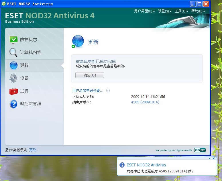 第一次手工升級病毒庫完成之后,NOD32 4.0軟件將每隔1個小時左右,自動同步最新的病毒庫信息。之后用戶無需手工升級。