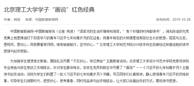 為加強學生理想信念教育,圍繞扎實開展“不忘初心、牢記使命”主題教育活動,北京理工大學設計與藝術學院黨委將學院專業特色與學生思政工作相結合,針對學生群體特點,在學生黨員和新生中開展了“畫說”——《習近平的七年知青歲月》主題讀書創作活動。該院為學生們購置了一批《習近平的七年知青歲月》書籍,號召同學們認真研讀,靜心思悟青年習近平的歷練故事,引導學生們洞察時代、感受初心、思考青春,同時將品讀與創作相結合,讓大家以繪畫創作的方式,展現讀書感想。