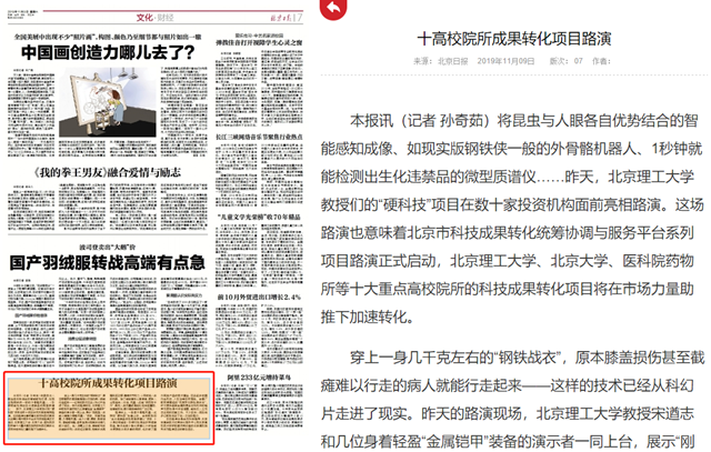 將昆蟲與人眼各自優勢結合的智能感知成像、如現實版鋼鐵俠一般的外骨骼機器人、1秒鐘就能檢測出生化違禁品的微型質譜儀……昨天,北京理工大學教授們的“硬科技”項目在數十家投資機構面前亮相路演。這場路演也意味著北京市科技成果轉化統籌協調與服務平臺系列項目路演正式啟動,北京理工大學、北京大學、醫科院藥物所等十大重點高校院所的科技成果轉化項目將在市場力量助推下加速轉化。