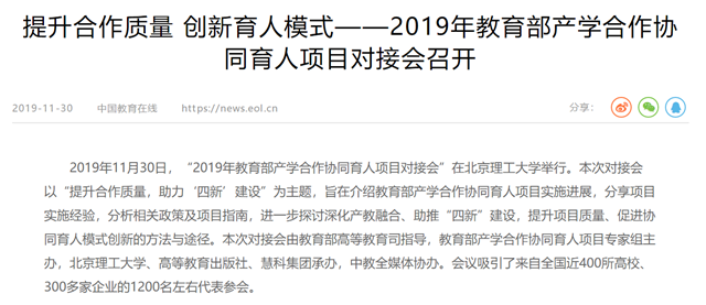 編輯:吳楠 審核:王征 閱讀次數(shù):原文標(biāo)題:提升合作質(zhì)量 創(chuàng)新育人模式——2019年教育部產(chǎn)學(xué)合作協(xié)同育人項(xiàng)目對接會召開