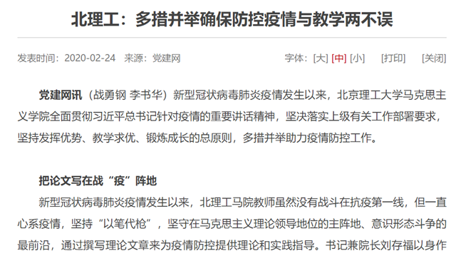 新型冠狀病毒肺炎疫情發(fā)生以來,北理工馬院教師雖然沒有戰(zhàn)斗在抗疫第一線,但一直心系疫情,堅持“以筆代槍”,堅守在馬克思主義理論領導地位的主陣地、意識形態(tài)斗爭的最前沿,通過撰寫理論文章來為疫情防控提供理論和實踐指導。書記兼院長劉存福以身作則,分別在黨建網(wǎng)發(fā)表文章《思政課教師要在疫情防控關(guān)鍵時期擔當作為》和人民論壇網(wǎng)發(fā)表文章《防疫關(guān)鍵時刻要抓實組織體系》;綱要教研室王娟老師連續(xù)在人民論壇網(wǎng)發(fā)表文章《讓科學防治貫穿疫情防控全過程》《戰(zhàn)“疫”中充分發(fā)揮大學生的積極作用》;思修教研室主任季雨老師在光明日報發(fā)表文章《<等著我>:當一個家庭擁有可傳承的精神力量》;思修教研室劉左元老師分別在人民論壇網(wǎng)發(fā)表文章《政治引領是打贏疫情“阻擊戰(zhàn)”的根本要求》和黨建網(wǎng)發(fā)表文章《民主革命時期中國共產(chǎn)黨疫情防控的歷史與經(jīng)驗》。另外,還有一些教師將相關(guān)研究論文投稿到期刊雜志,彰顯了北理工馬院教師的勇于擔當。