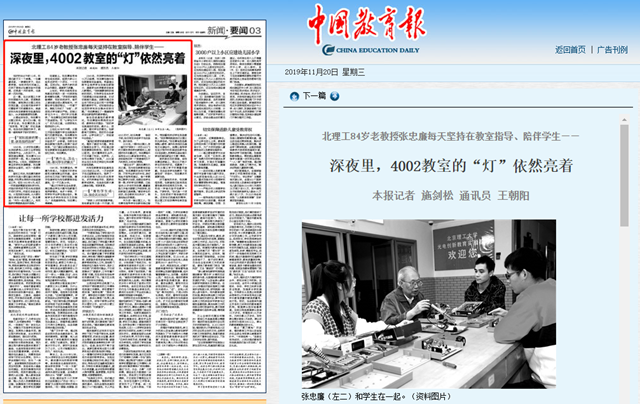 2016年,一篇《在北理工,有一盞燈叫“深夜十一點的4002”》的文章發表在學校新聞網上,短短時間點擊量過萬。張忠廉每天堅持在4002教室陪伴學生,10余年堅持這樣一個既普通而又不凡的舉動,令師生們敬佩。