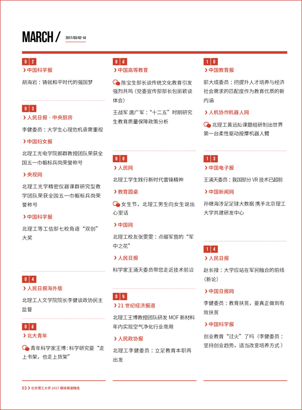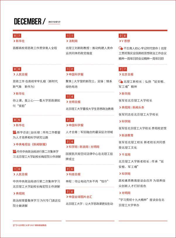 【編者按】“圍繞中心、服務大局、內聚力量、外樹形象”,北京理工大學黨委宣傳部始終堅持正面宣傳、堅持團結穩定鼓勁,堅持落實“兩個鞏固”的根本任務,牢牢掌握新聞輿論的主導權話語權,涵養化育一流大學文化,把新聞宣傳工作作為展示高等教育改革發展成就的重要窗口,加強對外宣傳工作的展示、塑造、公關、疏導、傳播和對接的功能。2017年,黨委宣傳部聚焦學校立德樹人根本任務和中國特色世界一流大學建設,統籌內宣外宣,主動設置議題,提升策劃能力,加強媒體溝通,推動社會媒體對北理工的正面報道長流水、不斷線,促進學校對外宣傳從平面媒體向多媒介轉變、從簡短報道向縱深報道轉變,進一步提升學校美譽度和影響力。