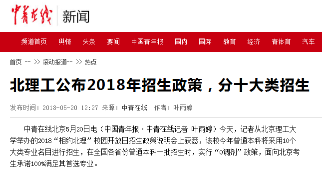 【中青在線】北理工公布2018年招生政策,分十大類招生