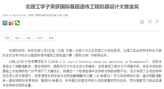 【中國科技網】北理工學子榮獲國際基因遺傳工程機器設計大賽金獎