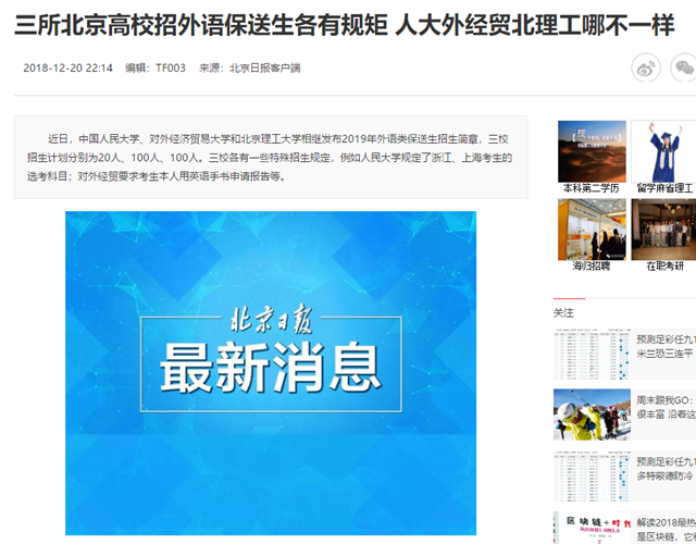 【北京日報(bào)】三所北京高校招外語保送生各有規(guī)矩 人大外經(jīng)貿(mào)北理工哪不一樣