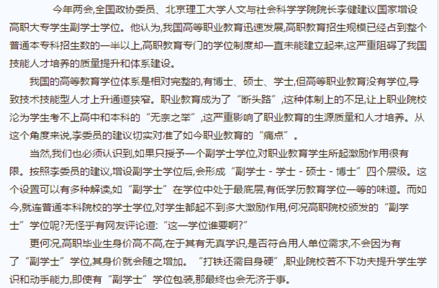 我國的高等教育學位體系是相對完整的,有博士、碩士、學士,但高等職業教育沒有學位,導致技術技能型人才上升通道狹窄。職業教育成為了“斷頭路”,這種體制上的不足,讓上職業院校淪為學生考不上高中和本科的“無奈之舉”,這嚴重影響了職業教育的生源質量和人才培養。從這個角度來說,李委員的建議切實對準了如今職業教育的“痛點”。