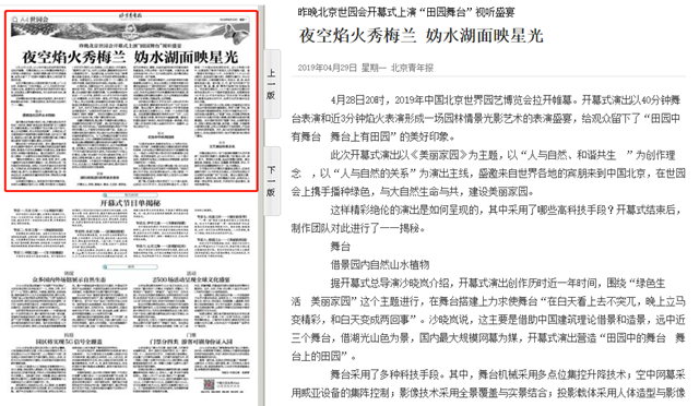 4月28日20時,2019年中國北京世界園藝博覽會拉開帷幕。開幕式演出以40分鐘舞臺表演和近3分鐘焰火表演形成一場園林情景光影藝術的表演盛宴,給觀眾留下了“田園中有舞臺 舞臺上有田園”的美好印象。