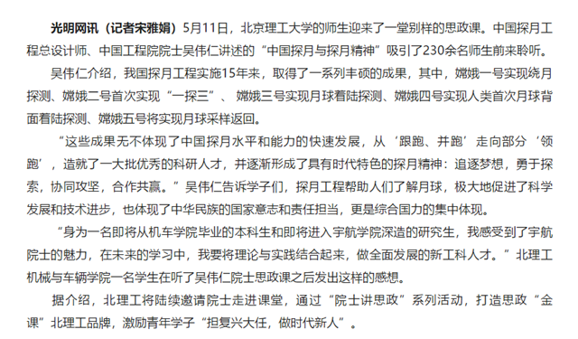5月11日,北京理工大學的師生迎來了一堂別樣的思政課。中國探月工程總設計師、中國工程院院士吳偉仁講述的“中國探月與探月精神”吸引了230余名師生前來聆聽。