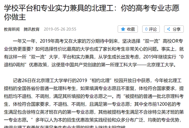 一年又一年,2019年高考又在大家的萬分期待中到來,堅決選擇“雙一流”高校OR專業優勢更重要?如何選擇性價比最高的大學也成了家長和考生非常關心的問題。事實上,就有這樣一所“雙一流”大學,平臺和實力兼具,從學生成長出發考慮,2019年繼續實行“0退檔0調劑”優惠政策,這便是中國共產黨創建的第一所理工科大學——北京理工大學。