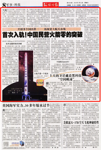 據《環球時報》記者了解,星際榮耀這次發射創造了中國民營商業航天歷史上的三個首次:中國民營商業航天運載火箭首次成功發射并高精度入軌;中國民營商業航天首次一箭多星發射入軌;中國民營商業航天首次實現太空廣告并視頻回傳。