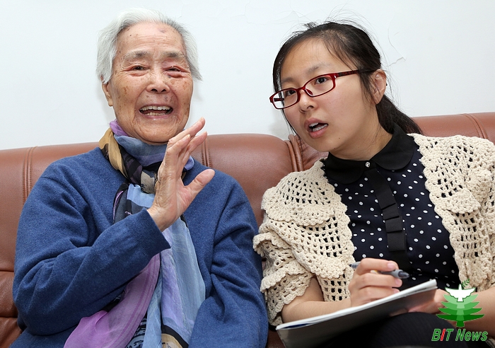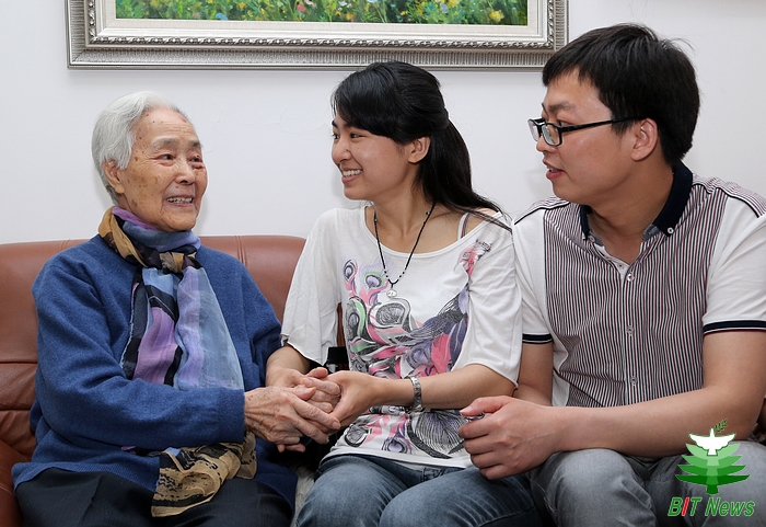 在三里河的家中,我們見到了這位老校友?;ò椎念^發映襯著她白晰的臉龐,滄桑的皺紋訴說著歲月的變遷。她身體消瘦,精神矍鑠,要不是介紹,真看不出這位老者已是95歲的高齡。雖然衣著簡樸,藍色的袖口已經起了毛邊,但是依然不能掩蓋她那婉約高貴的氣質。說起話來,她微微帶笑,眼睛里全是和氣,淺淺的、淡淡的,像盛開的葵花一樣溫暖——歲月帶給她的是恬靜安詳的內心和堅定忠誠的信仰。