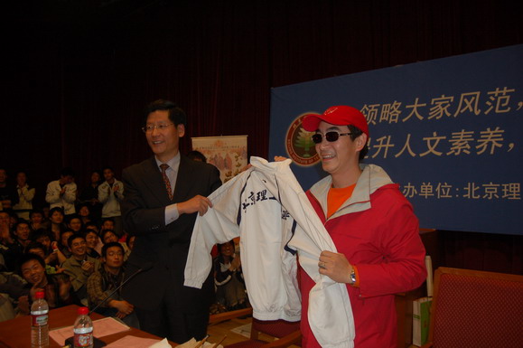 為了表示對(duì)章老師的歡迎,在講座開始前學(xué)生工作部部長(zhǎng)劉明奇代表學(xué)校把北京理工大學(xué)足球隊(duì)的最新版隊(duì)服、本次講座的精美海報(bào)和一些具有學(xué)校特色的紀(jì)念品贈(zèng)送給了章老師。