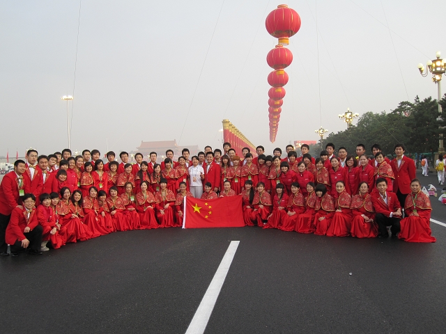 升旗儀式是整個慶典的開端,而我校的合唱團(tuán)的第一個“點位”恰恰就在離國旗不到5米的位置上,伴隨著解放軍聯(lián)合軍樂團(tuán)的雄壯的旋律,五星紅旗在合唱團(tuán)嘹亮的國歌聲中冉冉升起。在隨后長達(dá)1個多小時的閱兵式中,合唱團(tuán)成員沒有直接的演出任務(wù),但是所有成員必須在國慶慶典全部3個小時的時間里始終一動不動的站立在國旗之下,再加上試音階段的的時間合唱團(tuán)國慶當(dāng)天累計站立的時間超過了4個小時。演出結(jié)束后,信息學(xué)院2007級學(xué)生張晶的一句話道出了許多人的心聲:“閱兵式我們已經(jīng)看過多遍,已經(jīng)沒有太多新鮮感,在這種情況下站立就是堅持,但是一旦第一首表演歌曲《紅旗頌》的音樂響起時,突然全身又充滿了力量。”