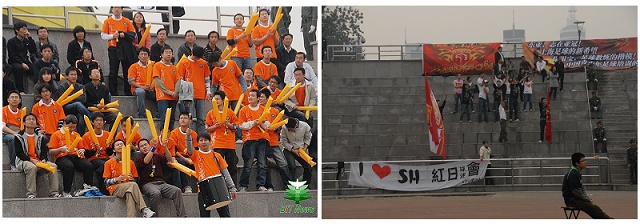 現場球迷也高呼“高洪波必勝”。東亞也來了10多個球迷,他們高喊“東亞是冠軍”,高高揮舞東亞隊的隊旗。