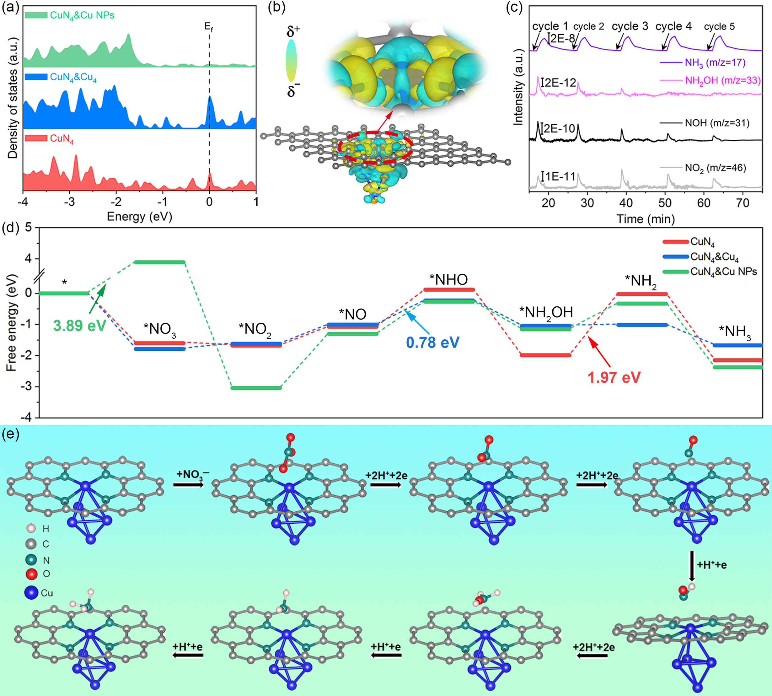 密度泛函理論(DFT)計(jì)算表明CuN4&Cu4結(jié)構(gòu)中CuN4與Cu團(tuán)簇之間的強(qiáng)相互作用通過上移單位點(diǎn)Cu的d帶中心以增強(qiáng)對(duì)反應(yīng)底物和中間體的吸附。此外,Cu團(tuán)簇改善了單位點(diǎn)Cu的電荷分布和電子結(jié)構(gòu),并加速了反應(yīng)中間體*NH2OH到*NH2的快速轉(zhuǎn)化,最終在CuN4&Cu4結(jié)構(gòu)上可實(shí)現(xiàn)最優(yōu)的電催化NH3產(chǎn)出性能。