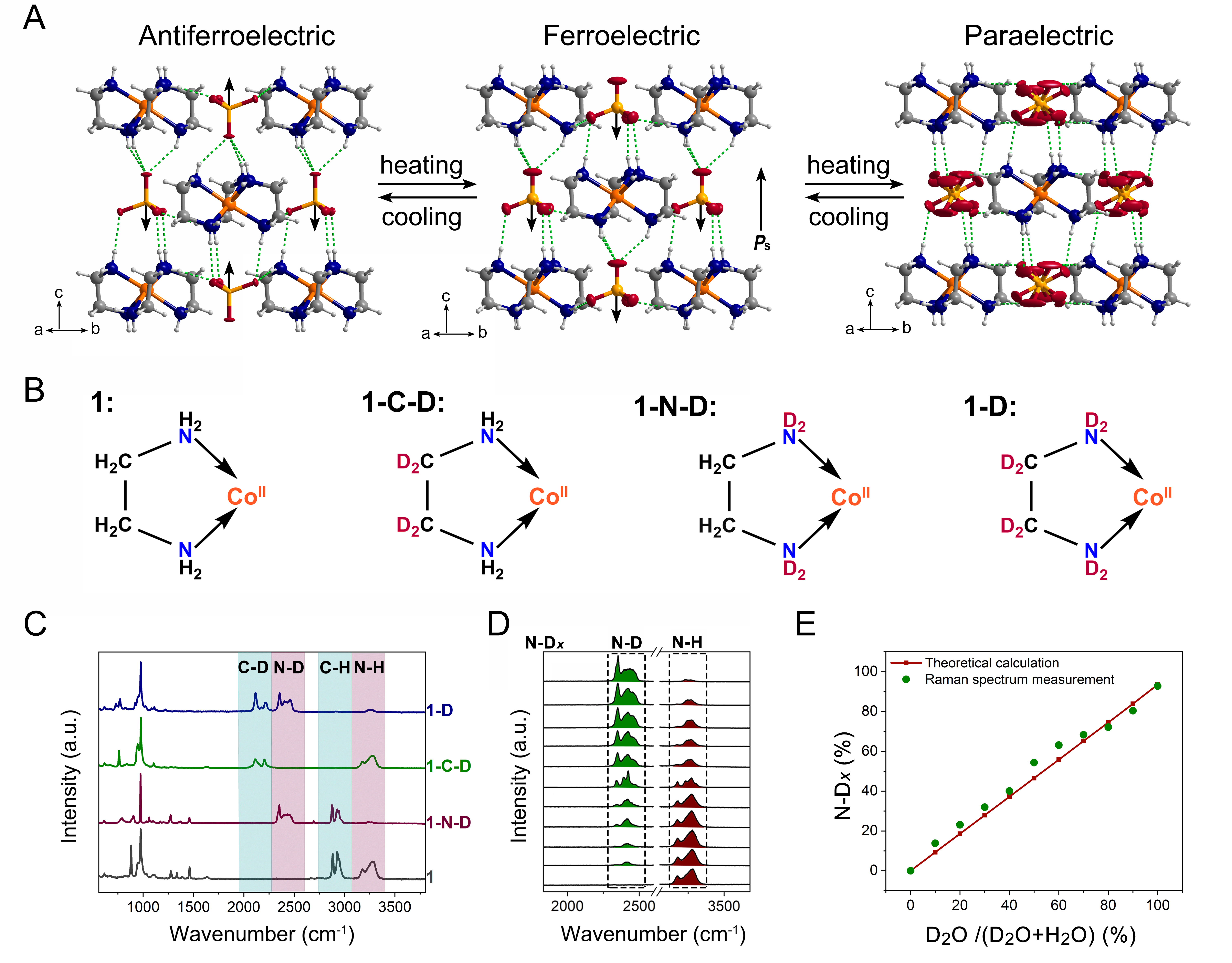 自1931年發現氘同位素以來,氘代被廣泛用于調控材料的化學和物理性質。1942年,研究者發現氘代KH2PO4(KDP)后材料的鐵電相變溫度提高107 K,隨后氘代被進一步研究應用于調控材料的導電、磁性、熒光性質等。在目前已知的研究體系中,顯著的氘代效應發生在伴隨質子轉移的強氫鍵結構中,而對于更為普遍的弱氫鍵體系,氘代效應并不明顯,這個問題極大的限制了氘代在物性調控方面的進一步應用。