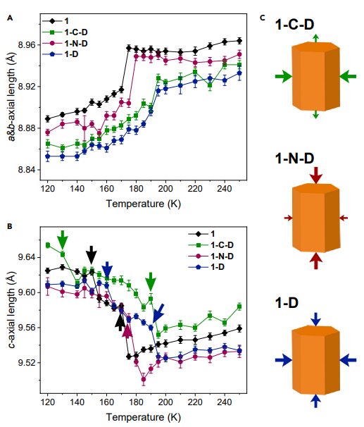 該研究團隊在前期通過結構變化調控材料物理性質的研究基礎( Nat. C hem., 2014 , 6, 1079-1083 ; Nat. Commun. 2019, 10 , 4805; CCS Chem. 2021, 2, 2464–2472; Nat. Commun. 2021, 12 , 6908; Angew. Chem. Int. Ed. 2023, 62, e202217977; J. Am. Chem. Soc. 2023, 145, 5545-5552),針對單晶晶格各向異性的結構特征,提出選擇性氘代引入各向異性化學壓力的研究思路,通過對具有三方晶系的硫酸三乙二胺合鈷鐵電化合物進行選擇性氘代,在弱氫鍵功能材料中實現了顯著的氘代效應。當對C-H原子氘代時鐵電窗口溫度從22 K提高到了56 K,自發極化值也增大4倍,而當對N-H原子氘代時,鐵電性質完全消失。通過變溫晶胞參數、倒異空間分析、介電溫譜、電滯回線、以及理論計算等對該現象進行了深入的研究。