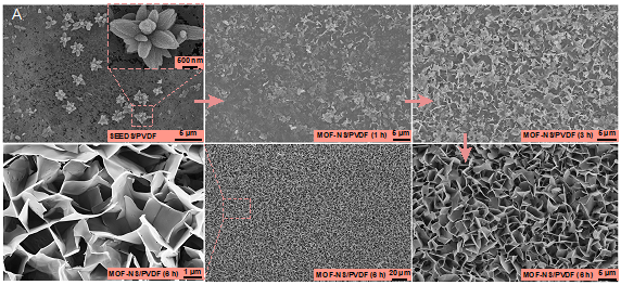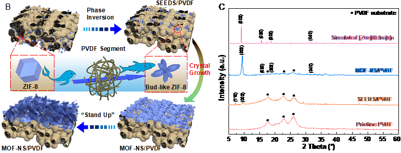圖1. MOF-NS/PVDF膜的制備方法及結(jié)構(gòu):(A)膜的表面形貌(從SEEDS/PVDF基底分別經(jīng)過1 h、3 h和6 h生長(zhǎng)后制備得到MOF-NS/PVDF膜);(B)SEEDS/PVDF膜和MOF-NS/PVDF膜的制備示意圖;(C)PVDF膜、SEEDS/PVDF膜、MOF-NS/PVDF膜和模擬的[Zn2(MeIm)4]n膜的XRD譜圖。