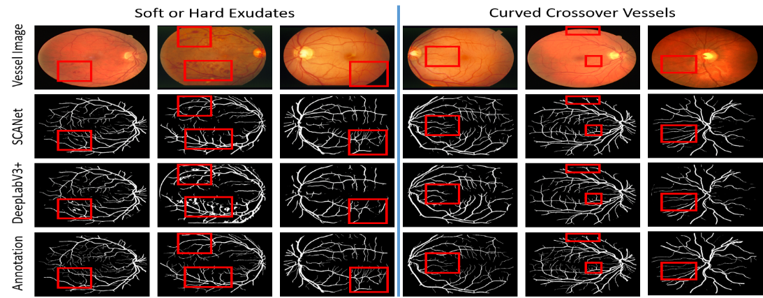 該分割模型不僅在靜脈血管影像上取得出色的表現,也在其他多個具有挑戰性的影像和皮膚病變影像數據集上都表現出明顯的性能優勢,通過在基準評價指標上的定性定量分析,證明了SCANet各組分結構的有效性。