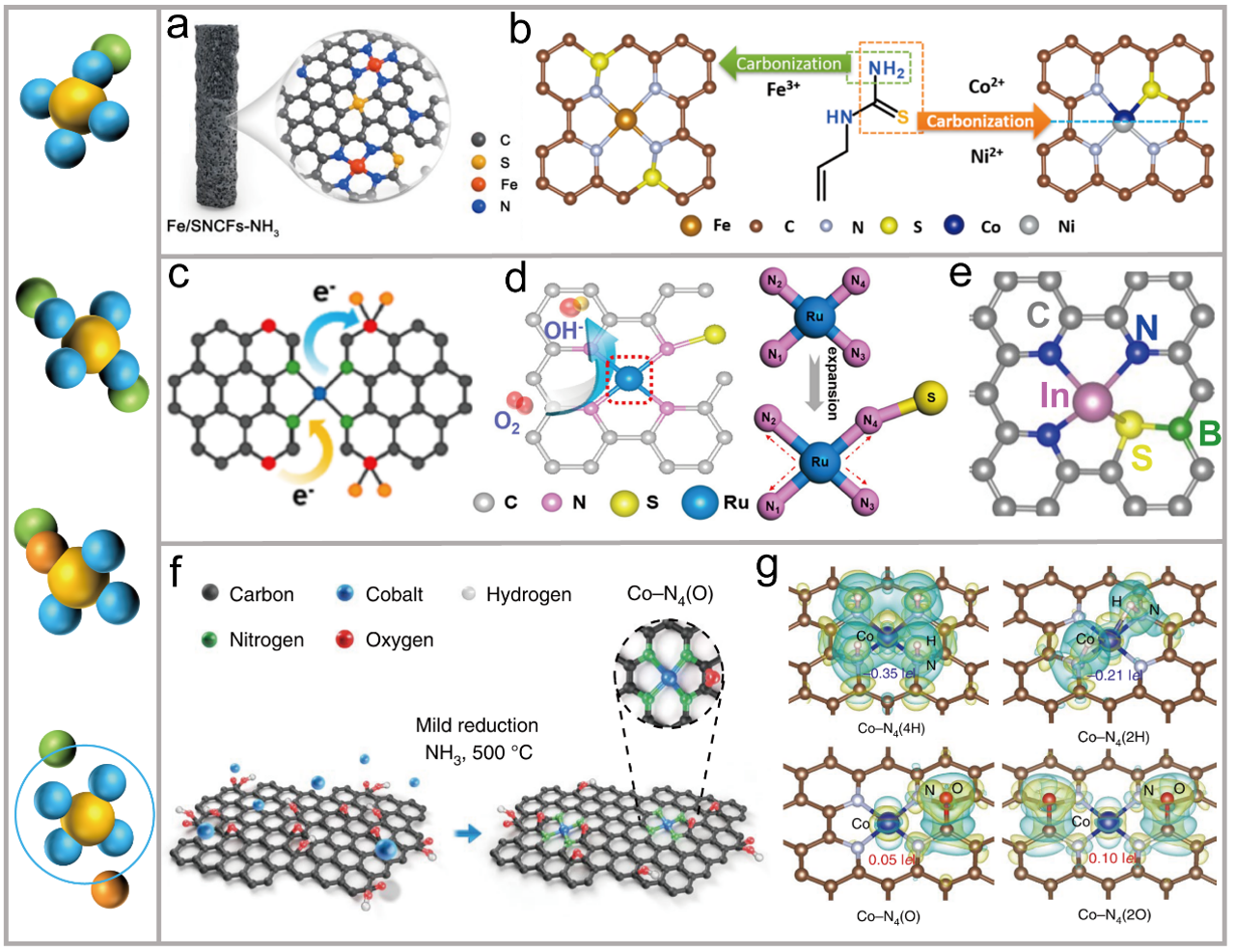 根據配位化學和晶體場理論,與中心活性金屬直接配位的原子可以對整體催化位點產生特定而顯著的作用。由于中心金屬位通常配位4個原子(通常配位為d-p σ-鍵),其鍵能或局域電子結構由第一個配位原子決定。