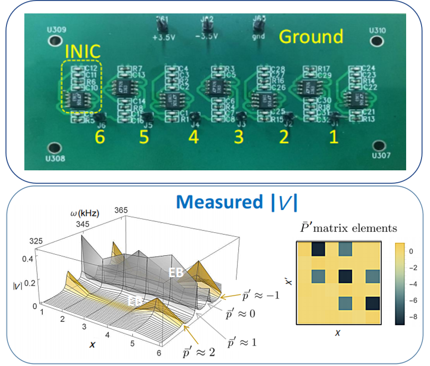 首先,研究人員基于量子薛定諤方程與電路基爾霍夫方程數(shù)學(xué)形式上的一致性,將奇異束縛態(tài)的晶格模型引入到電路模型中。他們的方案示意圖如圖1所示。該電路包含6個(gè)節(jié)點(diǎn)(標(biāo)記1-6),每個(gè)節(jié)點(diǎn)間通過(guò)電容和負(fù)阻抗轉(zhuǎn)換器(INIC)連接。INIC的具體結(jié)構(gòu)如右上側(cè)虛線框所示,它提供了電路中的非互易耦合連接。另外,每個(gè)節(jié)點(diǎn)都應(yīng)連接相應(yīng)的接地元件以保證在位能。這樣的一個(gè)電路網(wǎng)絡(luò)能夠與量子晶格模型之間存在良好的對(duì)應(yīng)關(guān)系。通過(guò)輸入電壓并測(cè)量共振頻率分布,研究人員就可以等效得到奇異束縛態(tài)的本征值和本征態(tài)等信息。
