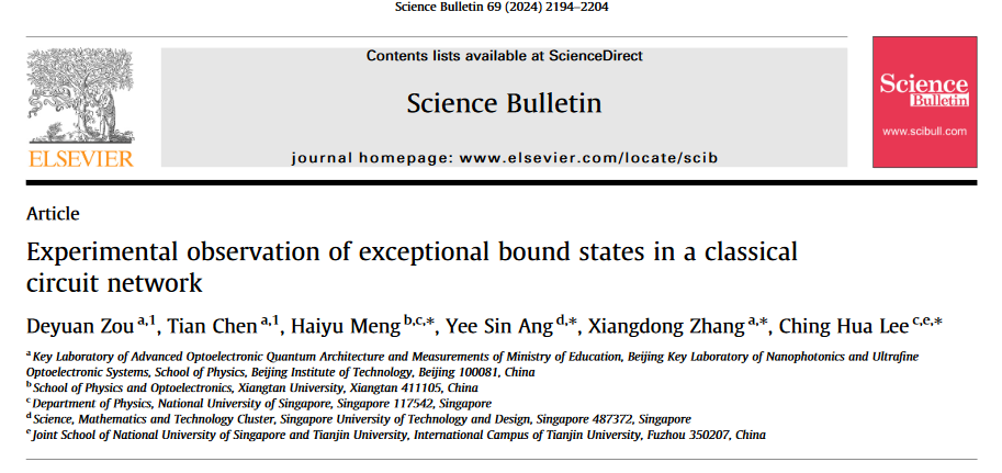 日前,北京理工大學(xué)物理學(xué)院張向東教授課題組和新加坡國(guó)立大學(xué)Ching Hua Lee等合作利用經(jīng)典電路網(wǎng)絡(luò)實(shí)現(xiàn)了奇異束縛態(tài)的實(shí)驗(yàn)觀測(cè)。相關(guān)成果以“Experimental observation of exceptional bound states in a classical circuit network”為題發(fā)表在Science Bulletin期刊[Science Bulletin 69 (2024) 2194-2204]上。北京理工大學(xué)集成電路與電子學(xué)院博士后鄒德源和物理學(xué)院陳天副教授為該論文共同第一作者,北京理工大學(xué)物理學(xué)院張向東教授、新加坡國(guó)立大學(xué)Ching Hua Lee、新加坡科技與設(shè)計(jì)大學(xué)Yee Sin Ang和湘潭大學(xué)孟海瑜為論文通訊作者。該研究工作得到了國(guó)家自然科學(xué)基金委的大力支持。