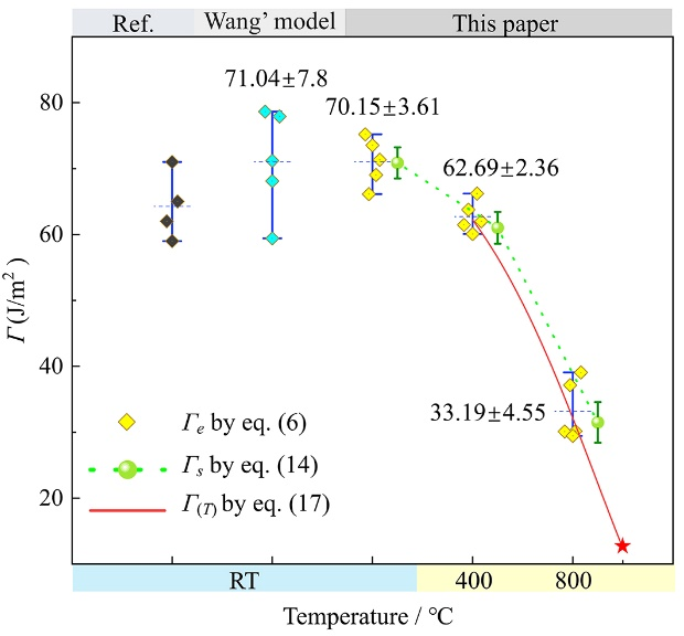 圖2 不同溫度下熱障涂層的界面韌性。紅線表示界面韌性隨溫度變化的預(yù)測模型。