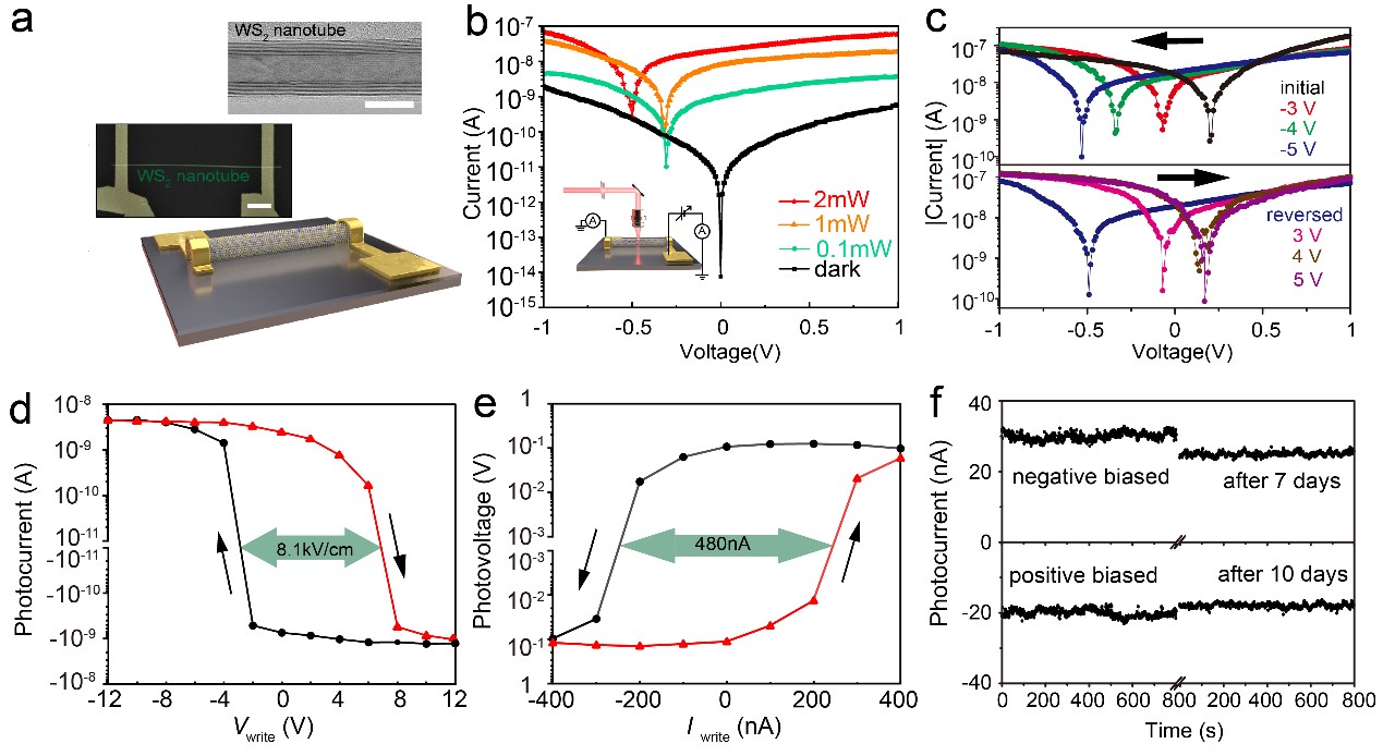 圖1 WS2 納米線PV-RAM器件(a)器件示意圖(b)器件的光伏響應(c)光伏響應的可編程性,(d-f)光伏響應的鐵電回滯和存儲