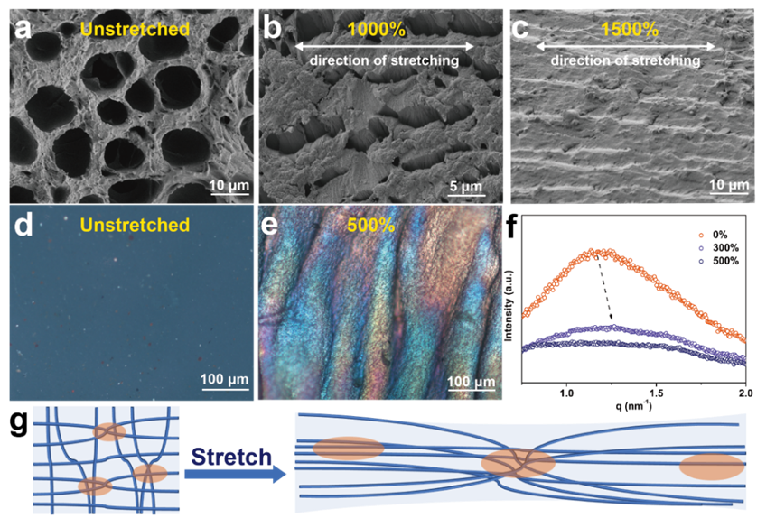 隨著延伸率增加,聚合物致密骨架網絡結構中的孔相應地沿著拉伸方向擴展(圖4a-c)。拉伸過程中同時伴隨干涉色出現(圖4d和e),表明拉伸后聚合物骨架向各向異性轉變。此外,聚合物鏈間平均間距變短(圖4f),表明聚合物中分子鏈彼此靠近,取向度增加。由于DAID-水凝膠骨架可均勻變形,因此實現了良好的高應變性能(圖4g)。同時,聚合物網絡定向排列有效耗散了能量以承受外力,從而增強了凝膠韌性。