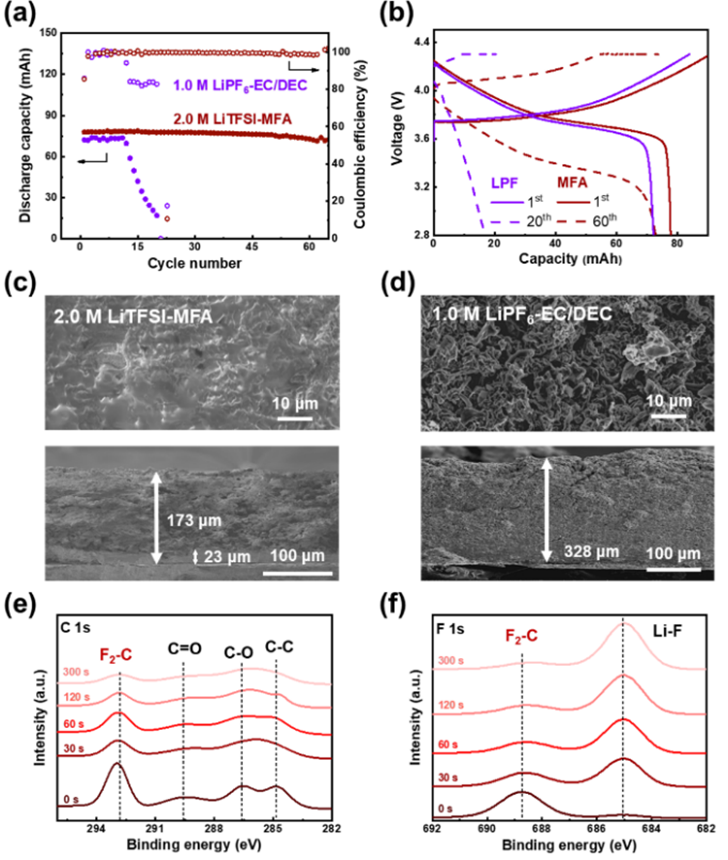 圖4. MFA電解液在金屬鋰電池中的電化學(xué)性能。
