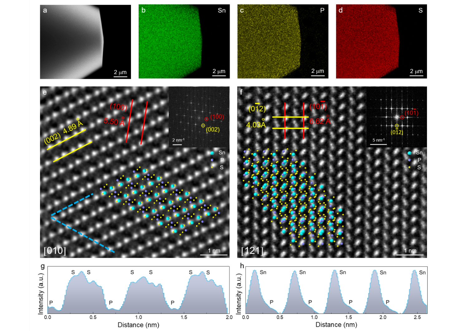 通過能量色散x射線能譜(EDX)和高角環形暗場掃描透射電鏡(HAADF-STEM)進一步研究合成的SnPS3的晶體結構。EDX測定Sn:P:S = 1.1:1:2.95,與化學計量比一致。此外,HAADF-STEM截面圖顯示SnPS3具有高的結晶質量,不存在原子空位。進一步結合選區電子衍射(SAED)分析,可以確定(002)和(100)的晶面間距為4.89 ?和5.50 ?。HAADF-STEM原子強度分布圖的周期性變化表明Sn、P、S原子排列規律,Sn-Sn原子鍵長可確定為5.80 ?。以上結果表明SnPS3的晶體結構具有高復雜性和低對稱性,是研究非線性光學(NLO)性質的合適候選材料。