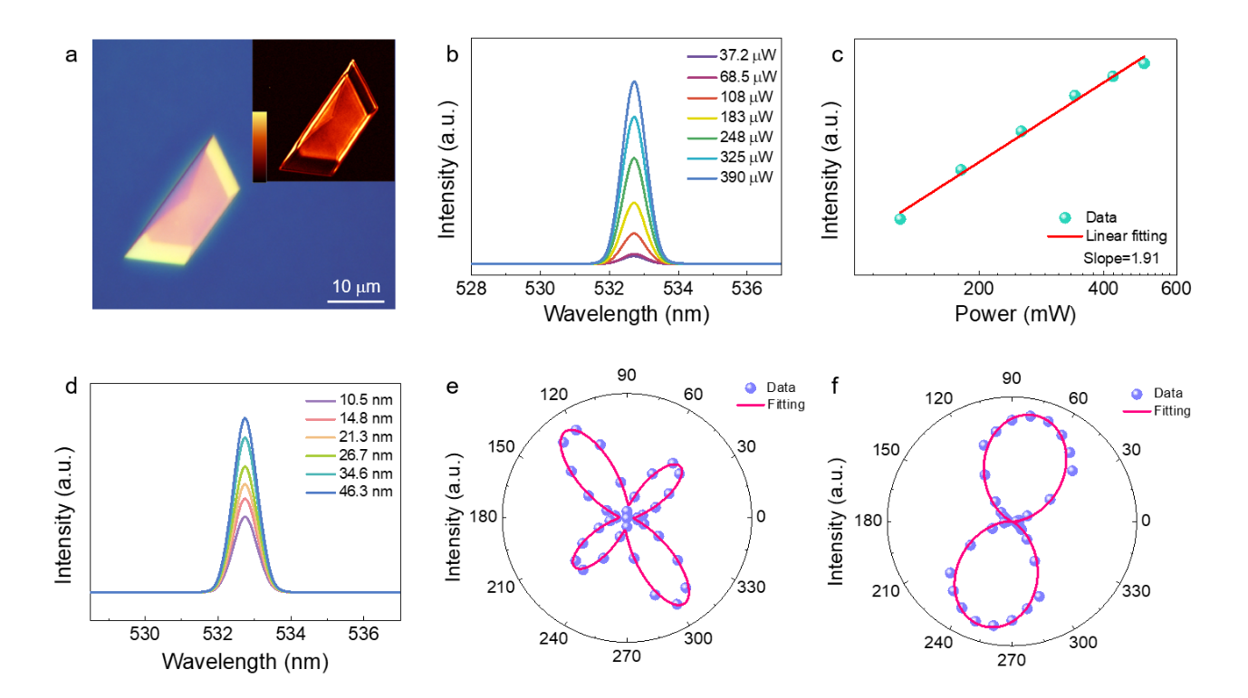 SHG源于入射光場下材料的二階NLO偏振,是識別TMPCs晶體結構的有效技術手段。具體來說,頻率為w的入射光子與NLO材料相互作用,產生頻率為2w的光輻射。本工作主要研究了1064 nm激光(15 ps,80 MHz)下的SHG測量。在功率依賴性SHG光譜中,可以清晰地觀測到位于532 nm處的單峰, SHG強度在對數坐標中線性擬合的斜率值1.91接近理論值2,符合二階NLO過程的特征。