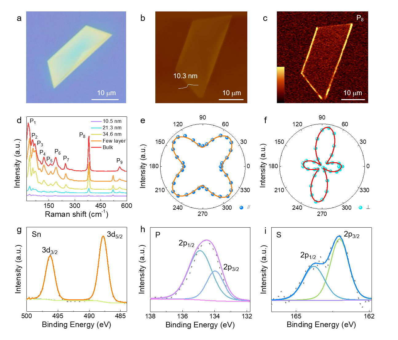 以SnPS3為例,樣品形貌呈梯形,橫向尺寸約為30 μm,厚度為10.3 nm。拉曼光譜中共觀測到P1 (38.9 cm-1)、P2 (57.8 cm-1)、P3 (72.1 cm-1)、P4 (120.5 cm-1)、P5 (160.9 cm-1)、P6 (192.8 cm-1)、P7 (248.7 cm-1)、P8 (381.3 cm-1)和P9 (560.1 cm-1) 9個峰,其中P1、P2、P5和P7峰屬于Ag模式,P3、P4和P9峰分別屬于Bg模式。所有拉曼峰均表現出角度依賴特征,在平行配置中,P1、P2、P3、P5、P7和P8的強度表現為4葉模式, P4、P6和P9的強度表現為2葉模式。而在垂直配置下,除P6外,其余8個拉曼峰均呈現4葉模式。這種現象可以通過經典的Placzek近似強度來理解,它與|ei?R?es|2成正比,其中ei表示入射激光的單位偏振矢量,R表示拉曼張量,es表示平行或垂直散射拉曼信號的單位偏振矢量。此外,x射線光電子能譜(XPS)實驗和擬合數據的一致性進一步證明了SnPS3高的晶體質量。