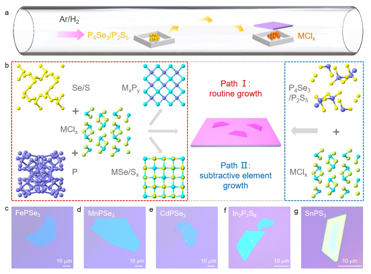 過渡金屬磷硫化合物(TMPCs)是一大類包含三種及以上元素的二維層狀材料,通常具有類似CdCl2晶體的準六方結構,由于獨特的電子結構和優異的光學、電子、光電、磁性和催化性能而引起了廣泛的研究興趣。然而,大多數關于二維TMPCs的研究主要通過液相剝離或機械剝離大塊晶體實現。迄今為止,通過化學氣相沉積(CVD)方法直接合成超薄TMPCs仍然具有挑戰性。首先,TMPCs通常由過渡金屬(TM)、磷(P)和硫/硒(X)組成,層間通過范德華力相互作用。金屬源P和S/Se通常用作前驅體,而P具有較高的化學反應活性,價態豐富,可形成TMPCs、MP、PaXb等化合物。因此,TMPCs的制備很難控制。其次,三種前驅體的共揮發不可控使得三元TMPCs的合成比二元材料更困難。因此,迫切需要開發一種通用的合成方法制備高質量的晶體,以研究其性質和應用。