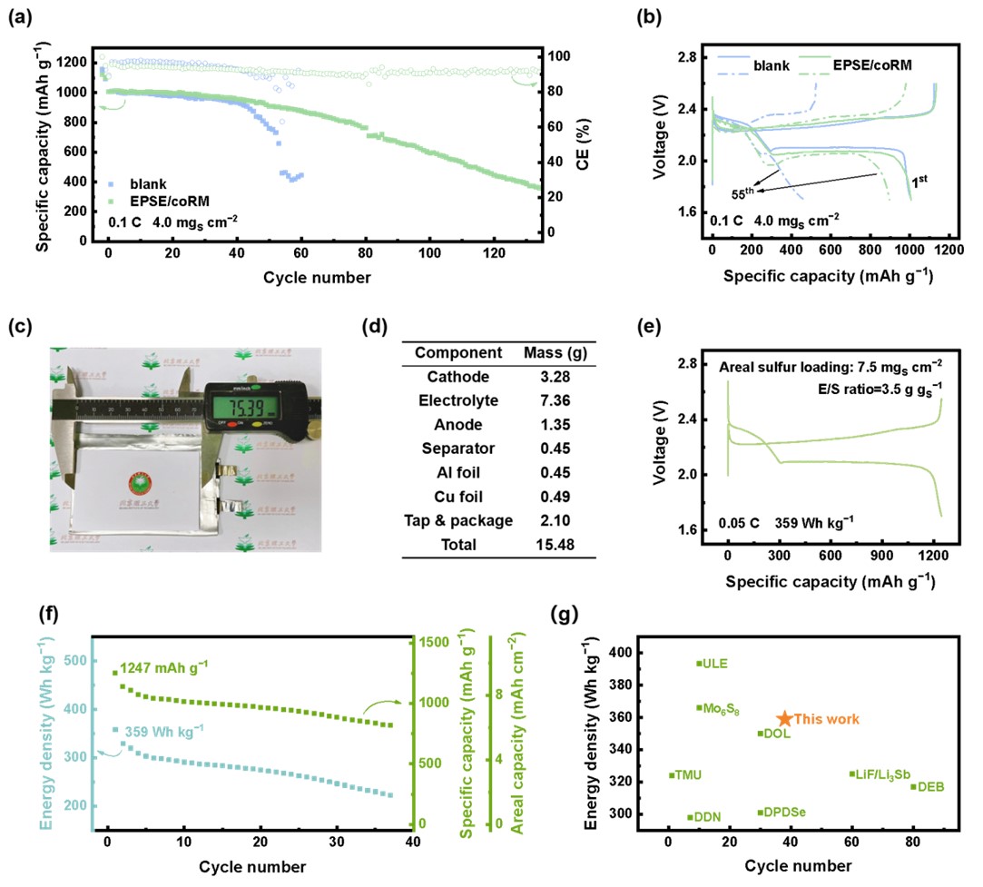在使用50 μm薄鋰負極和4.0 mgS cm?2高載量硫正極的條件下,EPSE/coRM體系在保持高放電比容量的前提下將鋰硫紐扣電池的循環壽命提升至130圈,較之應用常規DOL/DME電解液的鋰硫電池循環壽命延長近兩倍。研究人員進一步組裝并測試了設計容量為1.5 Ah 的EPSE/coRM鋰硫軟包電池,實現了359 Wh kg?1的首圈能量密度,并可以穩定循環37圈(能量密度基于所有軟包電池組件計算得到)。