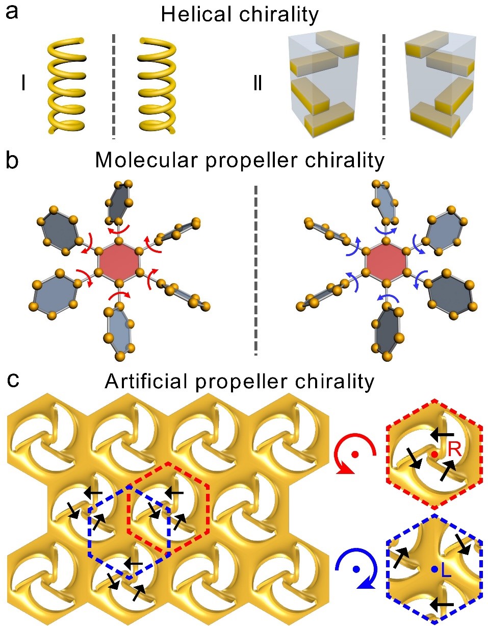 在之前的研究中,研究者主要利用具有明確旋向的螺旋幾何構型來增強光和物質的手性相互作用。然而,這類構型的光學手性響應要實現反轉,必須對其進行鏡面對稱操作,使結構發生巨大的改變。近年來,一種獨特的螺旋槳狀幾何構型在分子領域引起了極大的關注,通過輕微地翻轉“分子葉片”就可以反轉其光學手性響應。然而,這種立體旋槳手性的研究僅僅局限于分子領域,在微納光子學領域面臨制備方法上的挑戰。