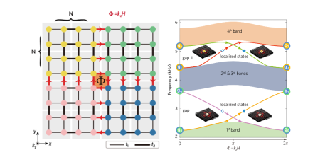 原二維聲子晶體被設計成最簡單的二維拓撲絕緣體模型:四重旋轉對稱(C4)的Su-Schrieffer-Heeger(SSH)模型。其等效后的二維晶格中心處類比通電螺線管,具有 Φ="kz(0~2π)" 的贗磁通(如下左圖),而其他元格上的磁通都為0。整個體系沒有打破時間反演對稱性,實現了一種聲學晶格上的“AB效應”。