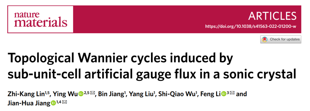 2022年3月22日,蘇州大學蔣建華教授團隊聯合北京理工大學李鋒教授和華南理工大學吳迎博士,在Nature Materials發表題為Tolological Wannier cycles induced by sub-unit-cell artificial gauge flux in a sonic crystal的文章。研究團隊利用3D打印技術,設計了一種具有螺位錯的聲子晶體,在實驗上實現了局域贗磁通和一維拓撲邊界態。其物理機制來源于實空間與倒空間的雙重拓撲特性。